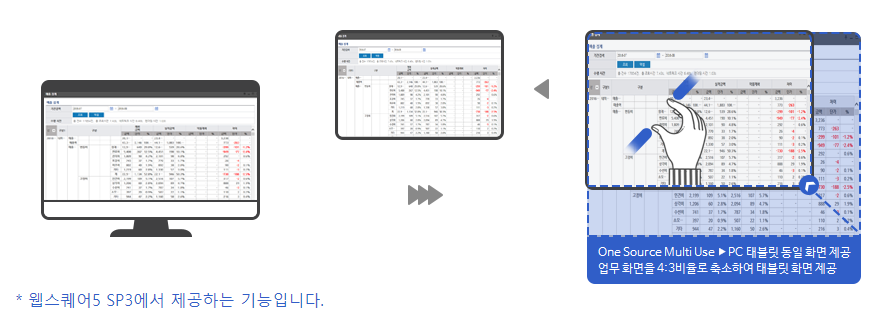 패블릿(Phablet)에서 PC까지 다양한 기기의 해상도에 맞추어 화면을 확대/축소 할 수 있는 새로운 개념의 One Source Multi Use 방식으로 복잡한 업무 구현에 최적 특히, 높은 사용자 편의성으로 모바일 업무에 적합하다.